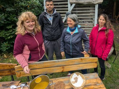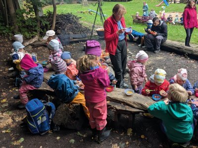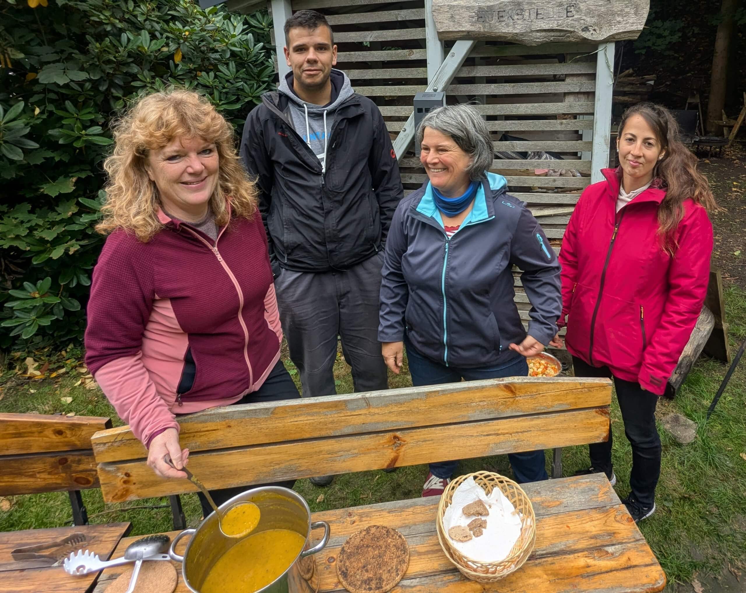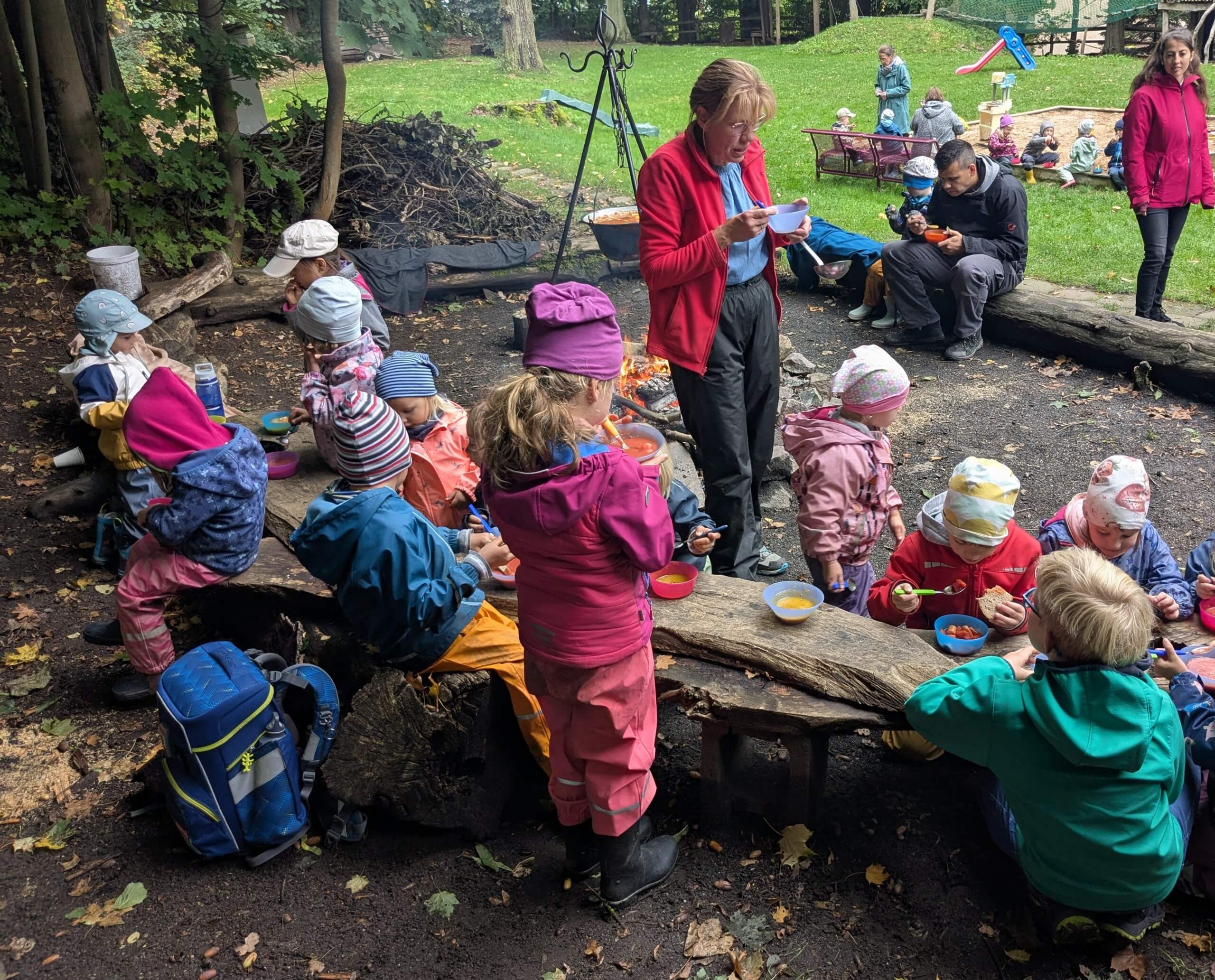 Zum Wochenende am Freitag war dann nach einer ausgedehnten Gartenzeit „Suppentag am Lagerfeuer“. Auch Eltern, die ihre Kinder abholten, wurden spontan eingeladen, ließen es sich schmecken und genossen die Gemeinschaft. Einigen war Verwunderung anzusehen, dass ihre Kinder nicht nur selbst gebackenes Brot und Würstchen, sondern mit großem Appetit auch die verschiedenen Gemüsesuppen verzehrten, zum Teil mehrere Schüsseln voll. Eindeutige Favoritin an diesem Tag: Die rote Variante mit roten Zwiebeln und Kartoffeln, Tomaten und roter Beete. Aber auch die anderen Suppen fanden ihre Fans. „Selbst gemacht schmeckt es einfach besser“, so das einhellige Fazit aller Beteiligten.