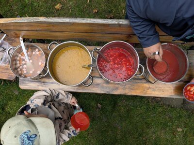 Danach stand für alle Küchenarbeit auf dem Plan. Mit viel Eifer und Begeisterung wurden verschiedene Sorten von Kartoffeln und Zwiebeln, Tomaten, Rote Beete, Zucchini, Kürbisse und mehr zerschnippelt. All das wanderte in vier große Suppentöpfe – auf Wunsch der Kinder nach Farben sortiert und anschließend fachkundig gewürzt.