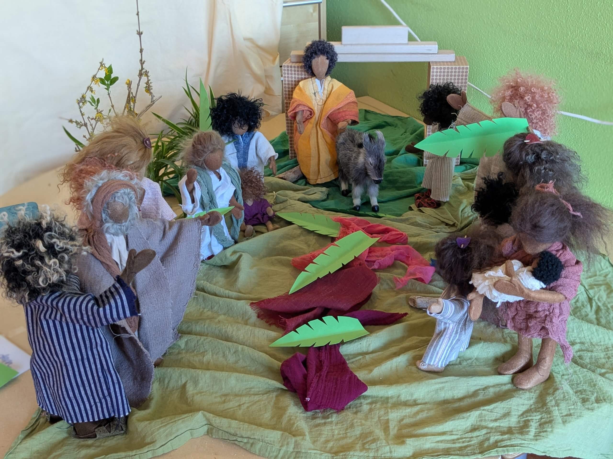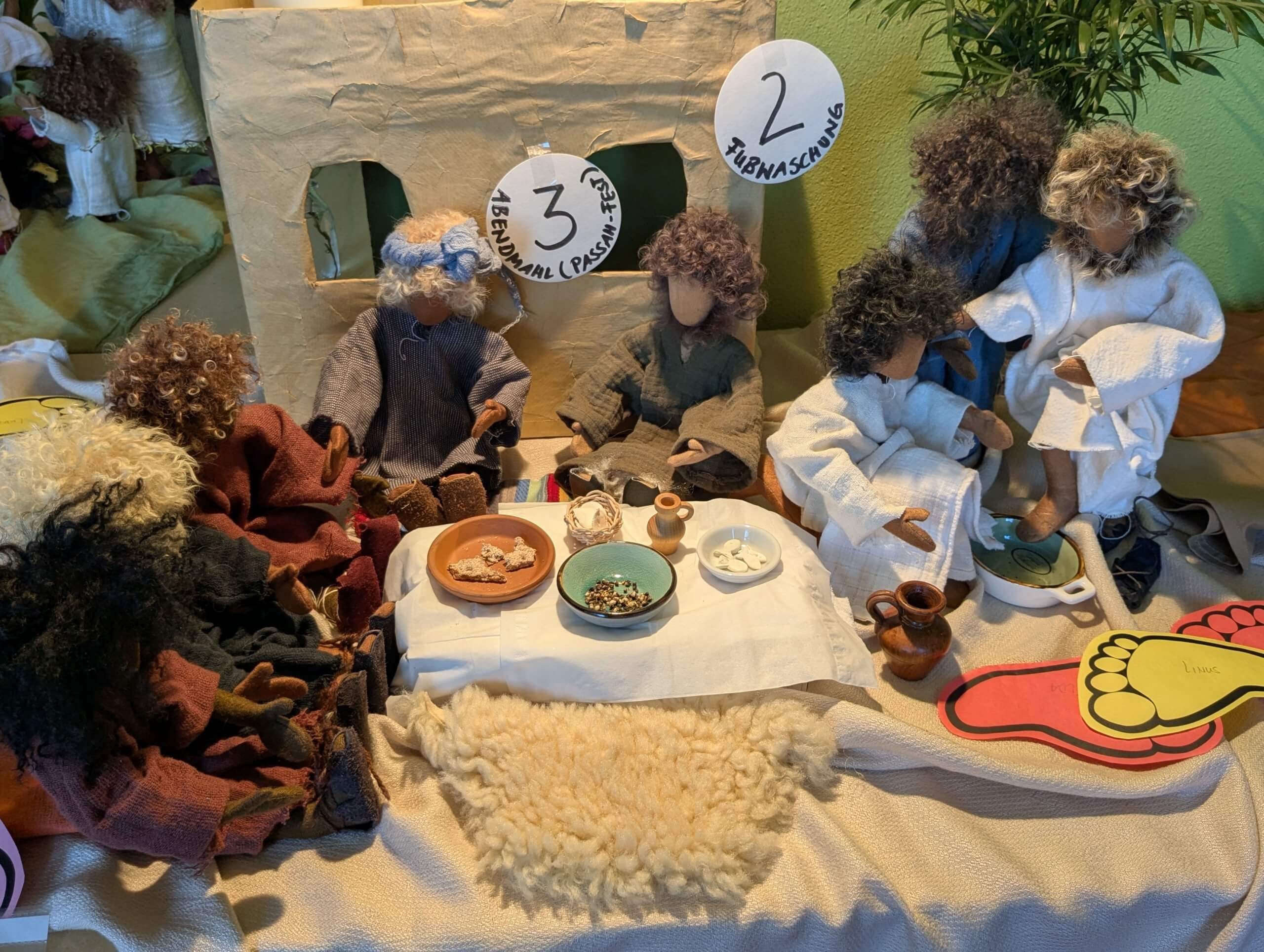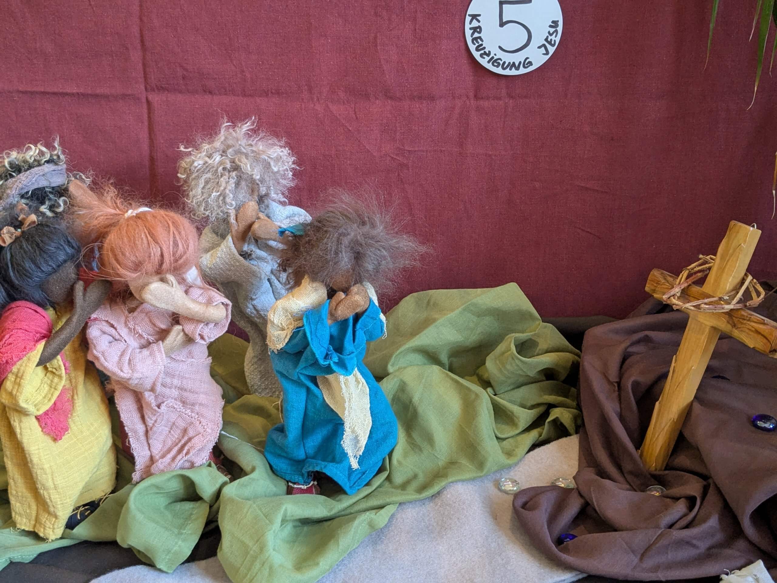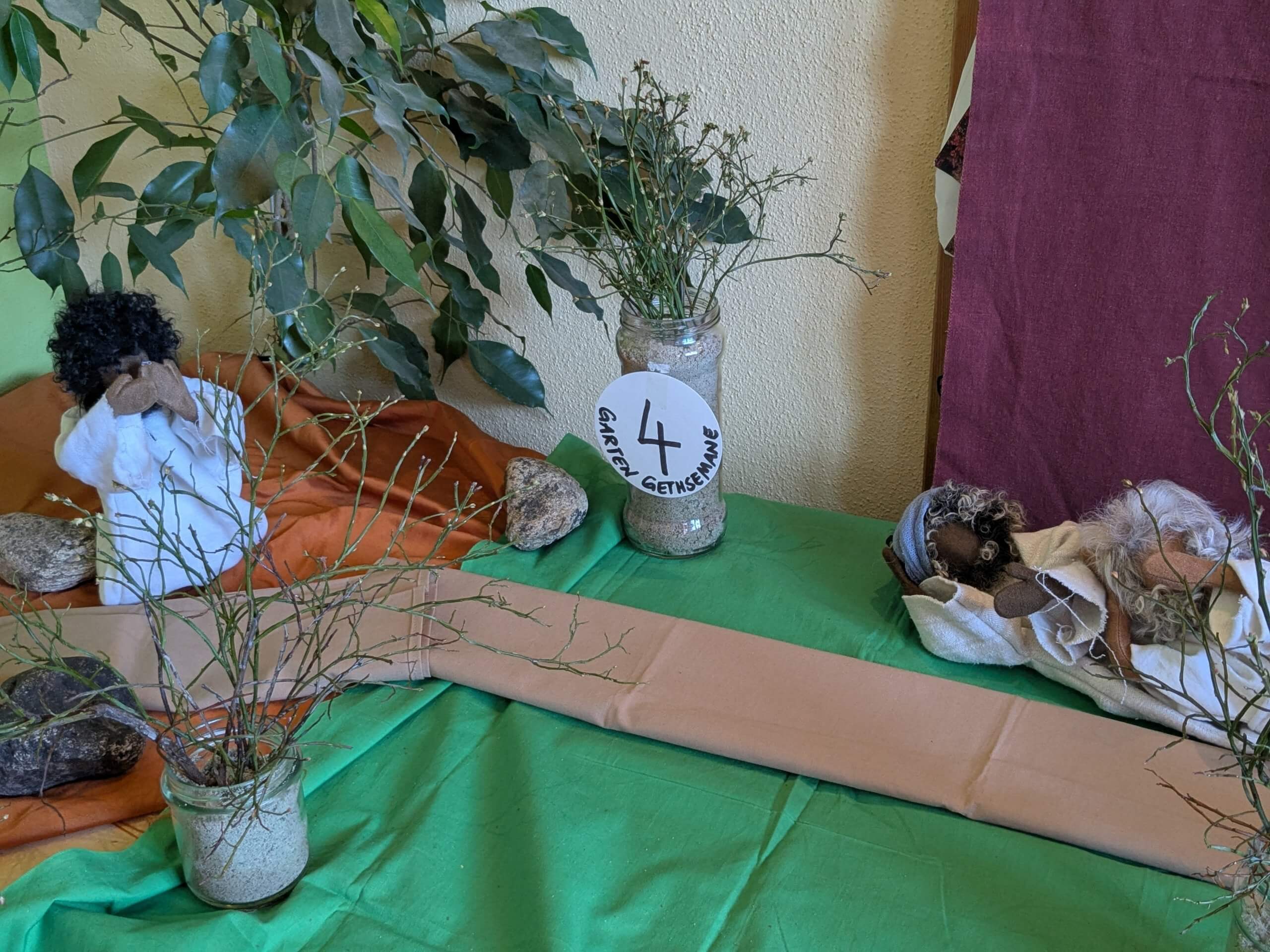 In der Woche vor dem diesjährigen Osterfest verwandelte sich unser Kindercafé Tag für Tag mehr zu einem „Ostergarten“. An verschiedenen, kreativ gestalteten Stationen wurden wichtige Ereignisse des Ostergeschens mit Egli-Figuren anschaulich gemacht und mit den Kindern besprochen; ebenso in den Gruppen.